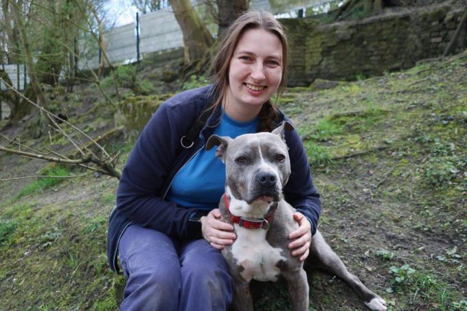 “Iris is een American Stafford van 6 jaar. We hebben dit teefje gesteriliseerd toen ze bij ons binnen werd gebracht door de politie”, zegt hondenverzorgster Eline Dewulf. “Passanten hadden haar gevonden, vastgebonden aan een paal en met een muilkorf aan. Het dier was wel gechipt, maar de gegevens van de eigenaar klopten niet meer, zoals wel vaker gebeurt.”