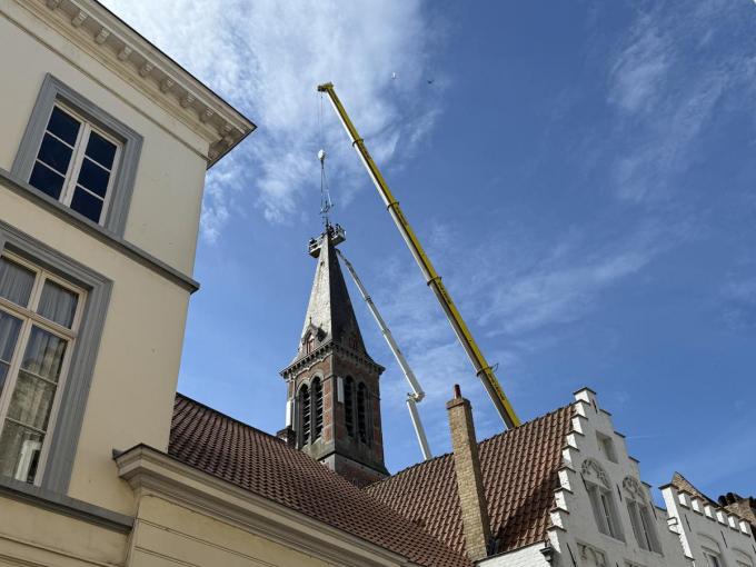 In het centrum van Brugge zijn maandag nieuwe werken gestart aan de Heilig Hartkerk waarvan de toren enkele weken geleden dreigde naar beneden te komen. Om vallende leistenen van de toren op te vangen, werden beschermnetten rond de spits geplaatst.