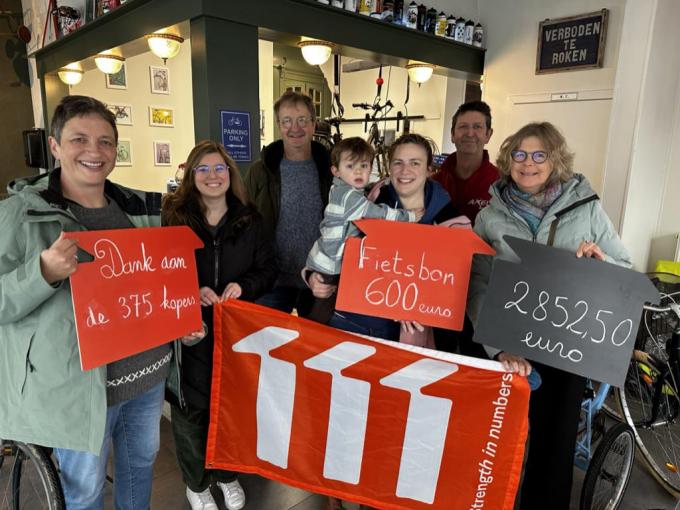 Sinds drie jaar verkoopt 11.11.11 Wevelgem een korf lokale producten waarvan de opbrengst gaat naar verschillende goede doelen. Bij die korf steekt een tombolabiljet waarmee een pak prijzen te winnen zijn, geschonken door lokale handelaars. Bette Van Doorslaer is de gelukkige winnaar van een bon van 600 euro, geschonken door Fietsen Axel. Daar werd de winnares ook gelauwerd en het resultaat van de jaarlijkse actie bekendgemaakt. Er werden in 2024 375 pakketjes verkocht, 37 meer dan in 2023. Zo kon het lokale comité 2.852,50 euro bijeenzamelen. We zien v.l.n.r. Ann Verbrugghe, Nicky Howie, Jos Deleu, winnares Bette Van Doorslaer met zoontje Moris, Axel Dejonghe van Fietsen Axel en Nele Mispelaere. (foto SL)
