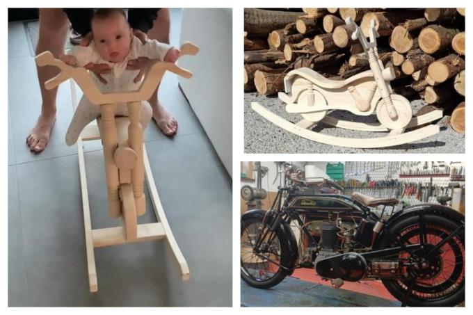 De houten schommelmotor van Bieke werd vervaardigd bij Madilux in Zuidschote, een firma die onder meer gespecialiseerd is in tuinhuizen, carports, afsluitingen en houten buitenspeeltoestellen maken. “Een van de collega’s vroeg me of we iets voor de babyborrel hadden staan in de toonzaal”, zegt Luc Grossey van Madilux. “Ze stuurde enkele foto’s door, waaronder een schommelpaard. En zo is het idee ontstaan om een schommelmotor te maken. Ik heb er ongeveer 35 uren aan gewerkt, van tekening tot afwerking. Het is niet op een bepaald type motor gebaseerd, maar uit het hoofd zoals ik die in gedachten had.”