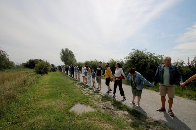 Die mensenketting werd gevormd als teken dat ze niet akkoord zijn met de plannen. “40% van de oppervlakte van de plas zou worden bedekt met het drijvende zonnepanelenpark”, aldus Paul Claus van de actiegroep De Put van Nieuwkapelle.