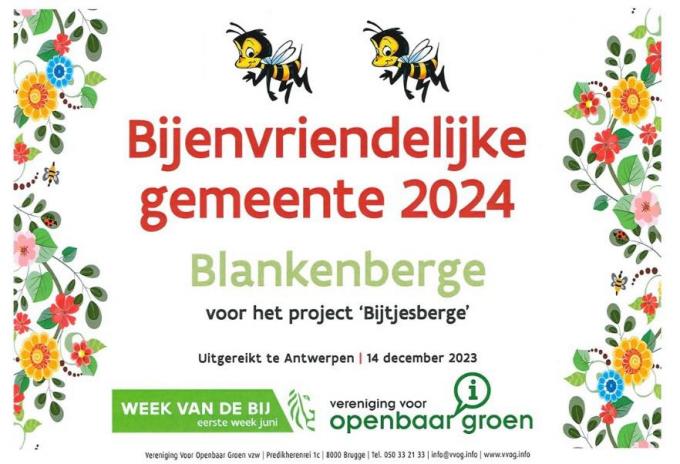 In de categorie ‘Bijenvriendelijke gemeente’ werd de stad voor de bijenburcht naast de tunneltoegang aan de Zinderdreef beloond met twee bijtjes op een schaal van vijf. De burcht en het bijhorende infobord vielen bij de jury erg in de smaak. De A. Ruzettelaan werd maar liefst twee keer bekroond, meer bepaald voor de herinrichting van de zone aan de duinen.