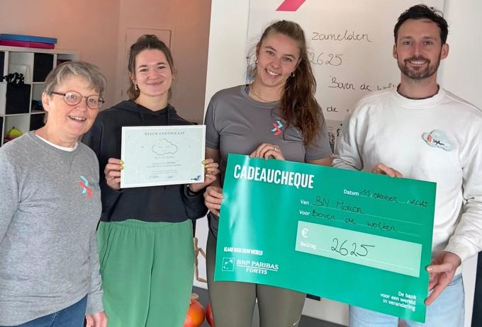 Vzw Boven de Wolken heeft een mooi duwtje in de rug gekregen van de Tieltse beweegpraktijk BN Motion. Nele Billiet, Katrien Depuydt en Tiele Verbrugghe overhandigden de vzw deze week een cheque van maar liefst 2.625 euro. Het gaat om de opbrengst van het sportieve event dat BN Motion op 11 oktober organiseerde. Toen werd 12 uur lang aan één stuk door pilates, yoga en personal training aangeboden voor het goede doel, terwijl ook de opbrengst van de gelegenheidsbar voor dat goede doel was. De drie dames blikken erg tevreden terug op hun actie. “Het was een groot succes, want we zamelden zelfs 1.000 euro meer in dan bij de eerste editie vorig jaar.” Deze keer werd Boven de Wolken gesteund, een vzw die gratis professionele foto’s maakt van sterrenkindjes. Stefaan Helderweirdt kwam persoonlijk de cheque in ontvangst nemen. (SV/gf)