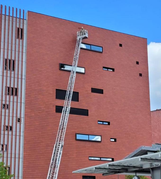 Daarbij werd de ladderwagen ingezet. Die moest tot op zijn maximale hoogte van 30 meter uitgeschoven worden om tot bij het loszittende stuk te kunnen.