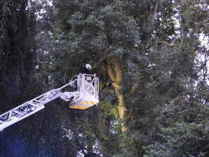 De brandweer werd er bijgehaald. Die kwam met de ladderwagen ter plaatse om het gestrande katje dat zo’n tien meter hoog zat te bevrijden.