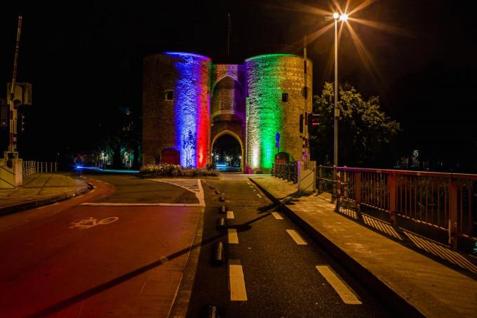 Om de inwoners zelf al volledig in de WK-sfeer onder te dompelen, baden de vier stadspoorten (zoals de Gentpoort op de foto), het stadhuis en de muur aan de kant van de Vrijdagmarkt tot en met 26 september in de regenboogkleuren.