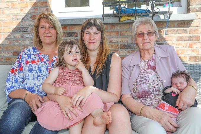 Gabrielle Vandenbroucke (79) uit Avekapelle, haar dochter Martine Corneille (52) uit Zwevezele, haar kleindochter Lindsay Bulcke (24) uit Westende en haar achterkleindochters Caily (2) en Carly Dumortier vormen samen een trots dubbel viergeslacht. De twee laatste telgen wonen samen met hun ouders in Westende.