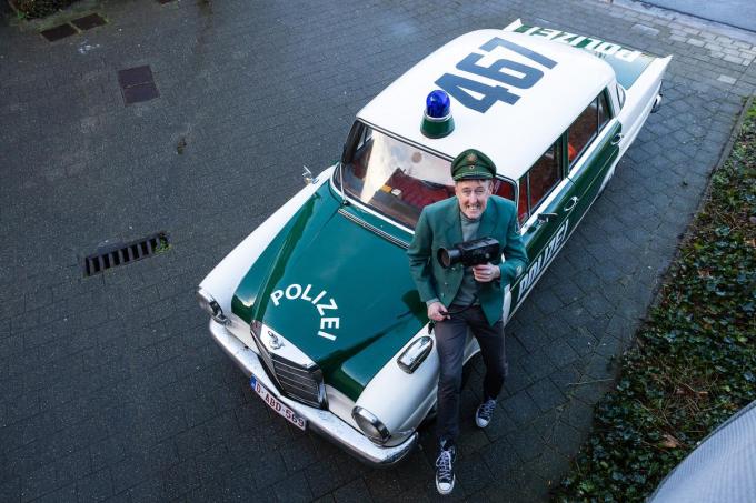 “Het was eigenlijk al mijn vierde oldtimer op rij. De derde bouwde ik ook al om tot een politiewagen”, zegt Bart Vantieghem, ook bekend als maker van de Dictator Dirk-strip in onze krant en als cartoonist voor De Zondag. Dat was een zwarte Mercedes die ik in 2012 kocht en voor lol door een vriend liet beletteren met het woord Polizei. De vleugels achteraan liet ik wit spuiten. In 2015 gaf die echter de geest, en ik ging op zoek naar een ander exemplaar om nog meer te verbouwen.”