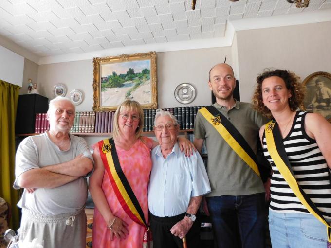 We herkennen v.l.n.r. zoon Jean-Pierre Vandecasteele, burgemeester Annick Vermeulen, de jarige Daniël Vandecasteele en de schepenen Stijn Timmerman en Charlotte Vermeulen. (foto BC)