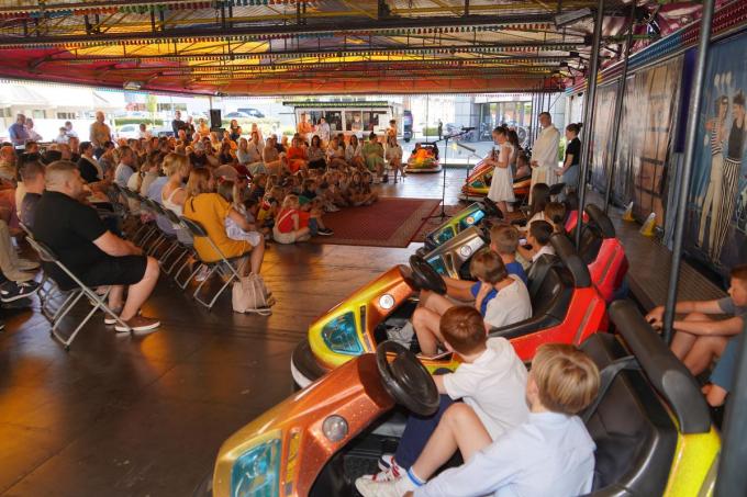 Het blijft een unieke gebeurtenis dat met de junikermis in Meulebeke zowel de eerste communicanten als de vormelingen samen met hun ouders de piste van de botsauto’s innemen voor een kort dankmoment.