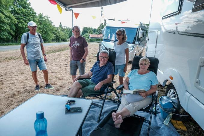 De eerste etappe van de Tour de France mag dan wel pas zaterdag passeren op de Mont Noir, de échte wielerfans staan er nu al met hun campers en tenten klaar. Zo ook Jan Van Overschelde (62) en Hilde Mervilde (60), die donderdag hun camper parkeerden en al volop aan het verbroederen zijn met andere kampeerders. “Op de Mont Ventoux moet je al een week op voorhand ter plaatse zijn, dan valt het hier nog mee”, vertelt Jan enthousiast.