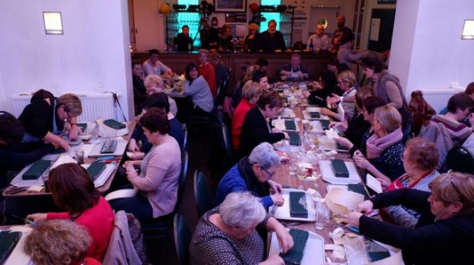 Dat het evenement een succes is, is licht uitgedrukt. De avond wordt verzorgd door Fred Verhaeghe, leraar bloemschikken aan de Provinciale Tuinbouwschool in Kortrijk. Niet minder dan 48 dames kijken vol aandacht naar de professionele aanwijzingen, gegeven door de leraar.
