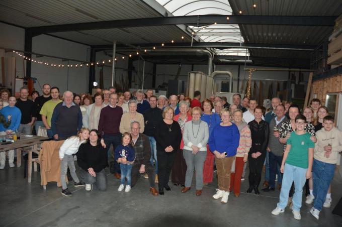 De bewoners uit de Dentergemstraat vormen al jaren een heel hechte buurt. Het goede buurtschap komt echter niet vanzelf, daar moet aan gewerkt worden. In de Dentergemstraat worden de banden nauwer aangehaald door de jaarlijkse organisatie van de nieuwjaarsreceptie die intussen aan haar 21ste editie toe is Vele jaren was de feestlocatie gevestigd op de hoeve van landbouwer Vanspeybrouck, maar sinds een vijftal jaar heeft schrijnwerker Giovanni Degroote zijn verwarmde werkatelier opengesteld voor de nieuwjaarsreceptie. Maar liefst veertig gezinnen, wat goed was voor 80 man, zakten af naar de feestlocatie, waardoor het atelier gezellig gevuld zat. De nieuwjaarsreceptie werd georganiseerd door Giovanni Degroote, Valérie Vanhoecke, Bert Hoste en Véronique Eeckhout. Op de foto zien we de Dentergemstraat op de jaarlijkse nieuwjaarsreceptie. (CLY/foto CLY)