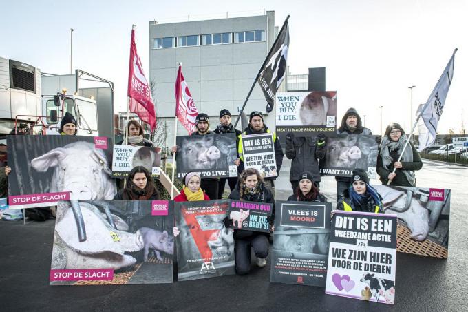Dierenrechtenorganisaties Animal Rights en All for Animals hielden woensdagochtend een actie nabij het varkenslachthuis Westvlees in Westrozebeke.