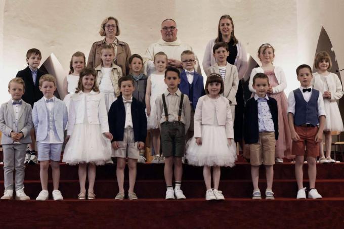 De leerlingen van de Vrije Kappaertschool en De Windroos vierden samen hun eerste communie. In De Windroos waren dit Alizée Bruneel en Elena Houwen en op de Kappaertschool Arthur Adam, Juul Bourgois, Clément Bruynooghe, Juliette Coolsaet, Noor De Backer, Bavo De Bruyne, Julien Debusschere, Lou Deleersnyder, Josephine De Rore, Jake Kesteloot Duthoy, Videlle Mahieu, Alex Merkac, Fons Roobrouck, Noor Van Parijs en Mats Werbrouck. (GJZ/ foto Eveline Van den Broeke)