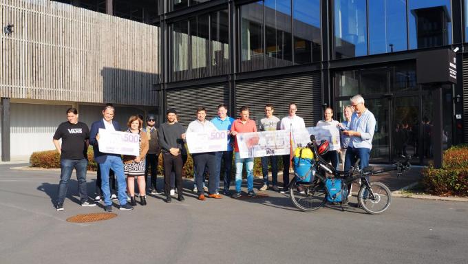 Lutz Tschenze startte zijn gesponsorde fietstocht in Kiel en beëindigde zijn avontuur aan het Cotton Park Business Center in Kortrijk. Daar werd hij enthousiast opgewacht door een ruime delegatie van Navitrans en de verantwoordelijken van de goede doelen. De vzw Fibroveerke is een ‘warme’ patiëntenvereniging erkend door het ministerie voor mensen met fibromyalgie met als werkingsgebied West- en Oost-Vlaanderen. T’Hope is een organisatie uit Roeselare die zich inzet tegen armoede.