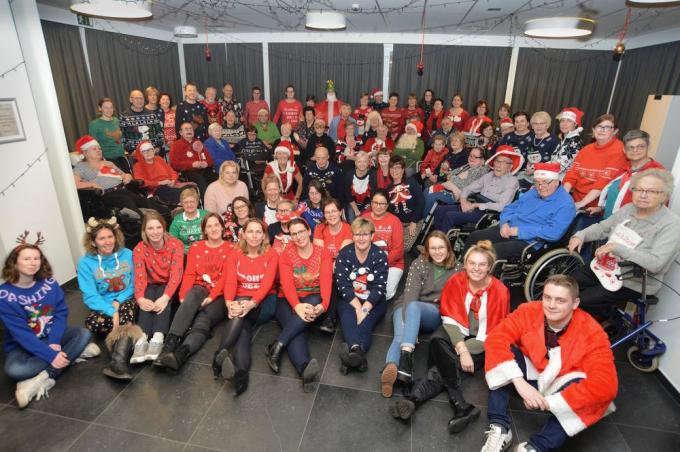 Ook in woonzorgcentrum Van Zuylen in Sint-Kruis bij Brugge gaat de kerstperiode niet onopgemerkt voorbij. In dit rusthuis gaan ze echter een stuk verder dan het plaatsen van de obligate kerstboom of het spelen van wat jingle bell’s muziek. In de cafetaria van het woonzorgcentrum werd namelijk een gigantische groepsfoto genomen met bewoners, familieleden én personeelsleden die zich allen in een opmerkelijk en liefst zo ‘fout’ mogelijke kersttrui hadden gehesen. Het is Evy Wouters, administratief bediende bij het woonzorgcentrum, die aan de basis ligt van het initiatief. “Vandaag 20 december is het de internationale Ugly Christmas Sweather Day; ja dat bestaat echt”, lacht Evy. “In ons gezin thuis hebben we daar al aan mee gedaan. Dan trekken we dus allemaal een gekke trui aan. En ik hoorde ook dat een viertal collega’s bij Mintus, de groep waartoe ook dit woonzorgcentrum behoor, het voor de grap al eens deden; zo’n foute trui dragen. Die dag staat trouwens ook aangeduid op de kalender van de zogenaamde gezondheidscoaches van Mintus. De gezondsheidscoaches geven uiteraard tips over gezond leven en werken maar ook voer een goede sfeer op de werkvloer. Het is dus ook ‘gezond’ om samen eens iets geks te doen. Dus heb ik hier het idee gelanceerd onder de collega’s om vandaag een gekke trui en andere kerstattributen te dragen. Ze vonden het ook een goed idee en dan hebben we er werk van gemaakt om ook de bewoners er warm voor te maken.