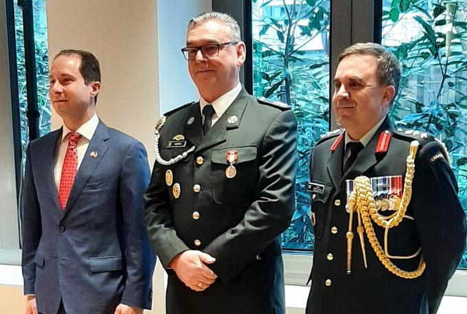 Op de Canadese ambassade ontving Frank Raeman (57) uit handen van de Canadese ambassadeur Nicholas Brousseau een militaire medaille. Hij ontving de medaille voor het identificeren en herdenken van gesneuvelde soldaten. Zo heeft hij geholpen bij het terugvinden en identificeren van de stoffelijke resten van verschillende Canadese soldaten en blijft hij zorgen voor Canadese oorlogsgraven op lokale begraafplaatsen, waarbij hij contact onderhoudt met de nakomelingen van de begravenen. “Al sinds mijn twaalfde zet ik mij in voor het herdenken en het niet vergeten van oorlogsslachtoffers, zonder onderscheid te maken tussen afkomst en geloof. Ondanks het feit dat dit mijn zesde buitenlandse ereteken is, dat ik hiervoor ontvang, raakt het bergen van een gesneuvelde mij nog steeds tot in het diepste van mijn ziel”, zegt Frank Raeman (midden). (MIWI/foto MIWI)