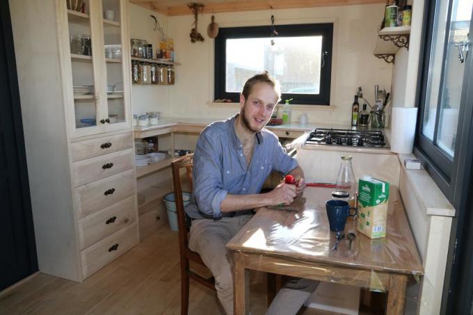 Terug van zijn tocht door Frankrijk begon bij Gaspard het idee te rijpen om een ecologische woning in elkaar te timmeren. “Tiny houses komen voort uit een trend die begonnen is in Amerika. Toen vanaf 2008 de economische crisis de huizenmarkt verzwakte, ontstond er onder een groep Amerikanen de behoefte om goedkoop, onafhankelijk en flexibel te wonen. Zij gingen aan de slag met het bouwen van hun eigen huisjes, de zogeheten tiny houses.” Gaspard werkte uiteindelijk zeven maanden aan zijn tiny house. De woning staat nu aan het VTI Ieper. De band met zijn familie die in de Westhoek woont, bracht hem naar de technische school. “De leerlingen van de houtafdeling zijn welkom om mijn huis te bekijken en ook om kritische vragen te stellen.”