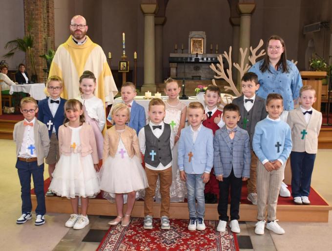 Op de foto zien we de communicanten Tibo Cardoen, Olivia Crombrugge, Luiz Dalle, Yirinka-Rosalia De Kerf, Devon Gevaert, Henri Ghesquiere, Lyes Koether, Jules Matton, Marcel Monsy, Victor Noyez, Arthur Pinseel, Marie-Lou Roussel, Izalynn Tant en Fausto Vercruysse. Zij worden vergezeld door hun juf Eva Ameye en priester Matthias Noé. (foto RB)
