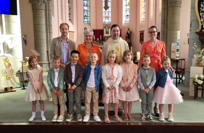 Zij deden hun eerste communie in de Onze-Lieve Vrouw Geboortekerk van Hollebeke. Op de foto herkennen we vooraan v.l.n.r. de eerstecommunicanten Ilayna Baron, Lucien Debeuf, Henri Deblock, Arthur Delevoye, Tessa Decin, Lore Meersseman, Gabin Nuytten en Naemeria Verly. Achteraan zien we v.l.n.r. schooldirecteur Frederik Roussel, parochieverantwoordelijke Els Morlion, deken Miguel Dehondt en juf Evelien Platteeuw die de viering van de eerste communie in goede banen leidden. (foto EG)