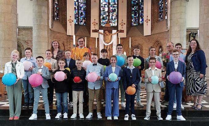 Ze werden gevormd tijdens een plechtige eucharistieviering in de Sint-Nikaaskerk in Diksmuide. Een feestelijke dag voor de leerlingen van Klimop: Matteo Boone, Vince Ceyfs, Owen Crevits, Robbe Degandt, Xandros Depoorter, Jole Desender, Liam Germonpré, Mathis Liephout, Djessey Maene, Jules Masschelein, Jasper Parmentier, Jonas Van de Broeck en Luca Vanmeenen. De vormelingen uit Nieuwkapelle heten Jarne Decorte, Senne Decorte, Baptiste Notteau, Charlotte Thery en Ziva Van Den Broeck. Vormheer was deken Wilfried Jonckheere en de catechisten zijn Gert Vandenberghe, Rik Verschingel, Elisa David en Petra Declerck. (foto ACK)