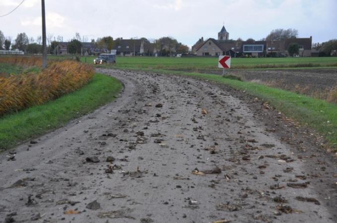 Mais en bieten worden er afgereden of uitgereden en doordat vele velden er nogal drassig bijliggen, komt er veel slijk en aarde op de weg terecht. De aarde zet zich vast in de banden van de zware machines en bevuilen zo het wegdek zoals woensdagnamiddag in de Julaenestraat in Steenkerke.