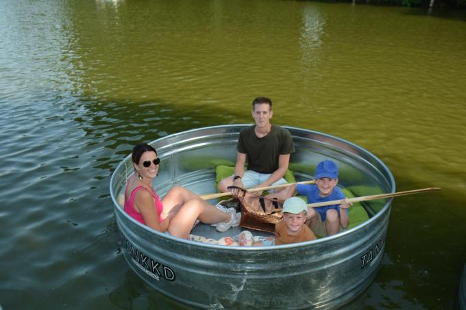 David van Watertanks KD: “Deze watertanks hebben we in Amerika gevonden, waar ze feitelijk gebruikt worden als grote drinkbakken voor het vee. We zijn er in geslaagd die naar ons land te importeren, waar we ze vooral aan de man brengen als klein zwembad voor in de tuin. Toen de eerste lading in Oostende aankwam, werd er ook eens mee gevaren op een meer, just for fun, in aanwezigheid van een filmploeg. Toen enkele dagen later de reportage op het tv-scherm te zien was, was het hek meteen van de dam en wilde iedereen het doen. Nu gebruiken we de watertanks dus ook als vaartuigen om op rivieren, meren en grote vijvers te genieten van het water.” (LB)