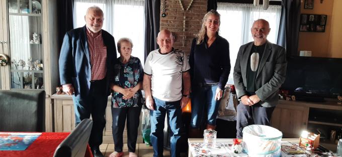 Het college van burgemeester en schepenen zette Daniel Baert (78) en Annie Van Acker (78) in de bloemetjes ter gelegenheid van hun diamanten bruiloft. Het koppel uit Middelkerke deelt al 60 jaar lief en leed en dat mag niet onopgemerkt voorbijgaan. Daniel werd geboren op 16 mei 1947 in Wichelen en Annie op 27 juni 1947 in Heusden. Annie en Daniel huwden in Melle op 17 december 1965 en kregen vier dochters. Ze zijn ook trotse grootouders van negen kleinkinderen en acht achterkleinkinderen. Daniel ging graag vissen en tegenwoordig kaart het echtpaar graag. Aan hun trouwdag hebben ze nog altijd de mooiste herinneringen. Annie en Daniel zijn naar eigen zeggen al zo lang gelukkig omdat ze altijd veel babbelen en duidelijke afspraken maken. (PG/foto PG)