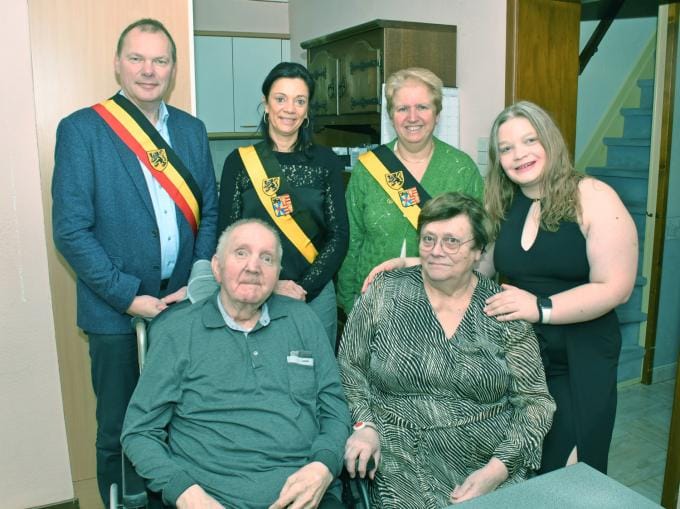 Camiel Notebaert (73) en Nadine Lalleman (69) zijn 50 jaar getrouwd. Op 13 december 1975 stapten ze in het huwelijksbootje. Camiel groeide op in Ieper in een gezin met een zus en drie broers. Hij werd gemeentearbeider, maar na een zwaar werkongeval raakte hij arbeidsongeschikt. Nadine bracht haar jeugd door in Sint-Juliaan. Na haar schooltijd in de Sint-Jozefsschool in Ieper werkte ze in de confectie en later bij Klippan. “Onze kennismaking gebeurde in café St.-Elooi op de Brieke in Sint-Jan”, vertelt Nadine. “We woonden eerst in Ieper, om in 1978 naar ons huidige adres te verhuizen.” De jubilarissen werden gefeliciteerd door een delegatie van het schepencollege. Op de foto: achteraan v.l.n.r.: burgemeester Lieven Vanbelleghem en de schepenen Valerie Deraeve en Marleen Soete, en kleinkind Auke Notebaert; vooraan de jubilarissesn Camiel Notebaert en Nadine Lalleman. (foto RB)