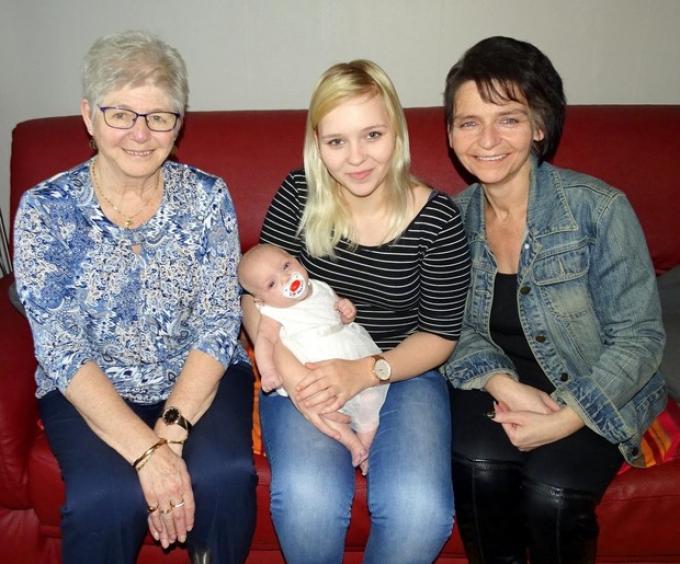 Diana Vermeulen (67) uit Oostende is vooral bekend in carnavalskringen. Zij is de moeder van Michelle Lahaeye (46), geboren en getogen in Oostende, maar nu in Moerbrugge (Oostkamp) woont. Aimey Verbanck (20) is de dochter van Michelle en woont ook in Moerbrugge. Aimey is de mama van de kleine Noor Van Bladel, drie maanden oud. (Foto FRO)