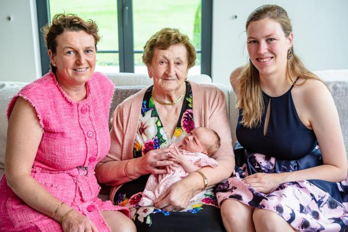 Veldegem is een viergeslacht rijker. Clémence Viaene zag op dinsdag 8 augustus het levenslicht. Ze is de dochter van Gilke Demedts (27) en Jeroen Viaene uit Veldegem. We zien hen samen met moeke Rosy Calleeuw (50) uit Lichtervelde en meme Godelieve Colpaert (86) uit Lichtervelde. (DC/foto DC)
