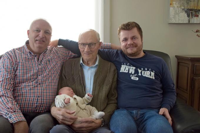 Gilbert Delva (86) uit Izegem is de trotse stamvader van een mannelijk viergeslacht. Op de foto zien we hem samen met zijn zoon Kris Delva (58) uit Izegem, kleinzoon Gilles Delva (33) uit Izegem en zijn achterkleinzoon Lukas Delva, die geboren werd op 2 december 2025 in het Sint-Andriesziekenhuis in Tielt. (foto KeMa)