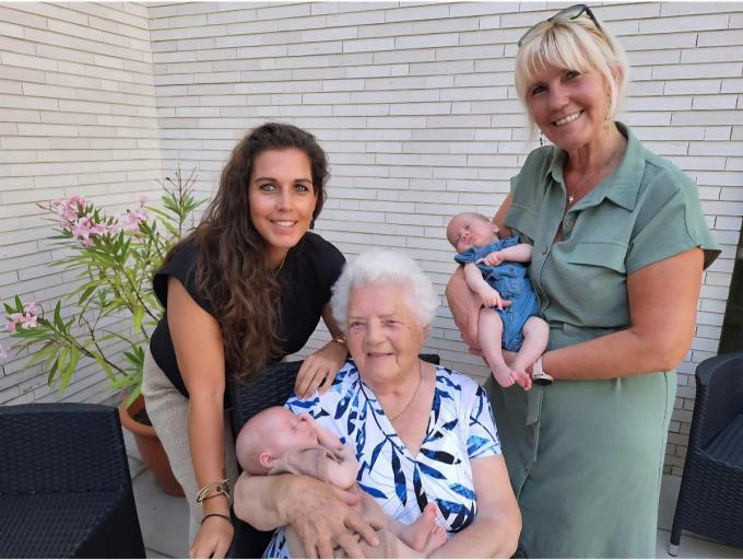 Links zien we de mama van de tweeling Gwendoline Demeyere (35) en rechts oma Caroline Vanhecke (60) met Rumi in de armen. Samen vormen ze een dubbel viergeslacht. (LB/foto Luc)