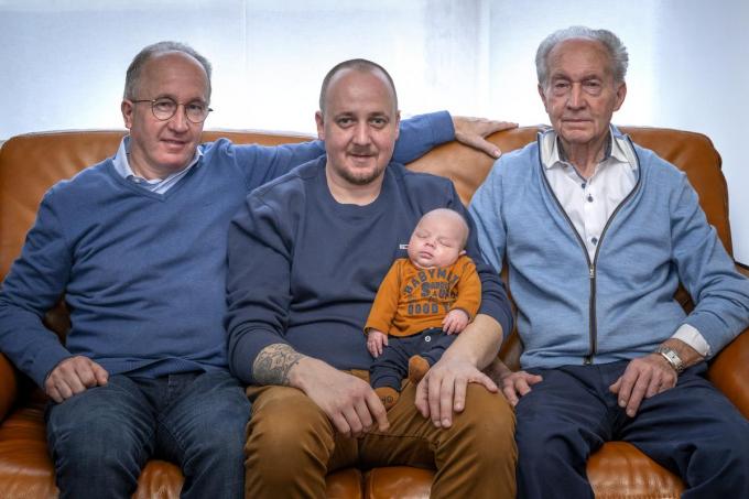 In de familie Kerkhof mogen ze sinds kort een mannelijk viergeslacht noteren. Op de foto zien we Benny Kerkhof (63) uit Oostnieuwkerke, Mathieu Kerkhof (36) met baby Storm Kerkhof (geboren op 3 januari 2025) uit Jabbeke en Marcel Kerkhof (85) uit Oostnieuwkerke. (foto JCR)