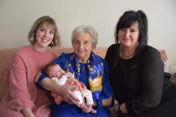 Op de foto poseert ze samen met haar dochter Sabine De Vriendt (56) uit Meulebeke, kleindochter Lisa Windels (29) uit Ingelmunster, en haar achterkleindochter Winnie, die werd geboren op 18 november.