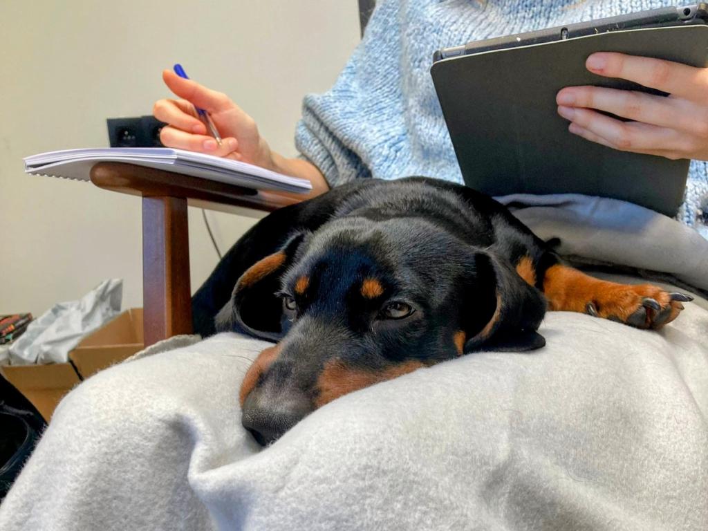 “Hij is een beetje onze mascotte geworden”, vertelt Lotte De Clercq (37), diëtiste en oprichter van ESpoir. “Gustie was er al bij toen hij nog een puppy was. Hij zoekt spontaan contact. In gesprekken met mensen met een eetstoornis is het vaak moeilijk om te beginnen praten. Een hond breekt dat ijs. Hij kruipt op schoot, legt zijn hoofd tussen je arm en je zij, en je voelt de rust letterlijk terugkeren.”