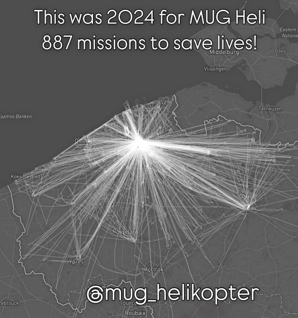 Aan een snelheid van 3 kilometer per minuut – of 200 per uur – kan de mug-heli de volledige provincie West-Vlaanderen bedienen. “Maar we voeren ook interventies in een groot stuk van Oost-Vlaanderen en Zeeuws-Vlaanderen in Nederland uit. En dit jaar zijn we zelfs naar Noord-Frankrijk moeten uitrukken. “