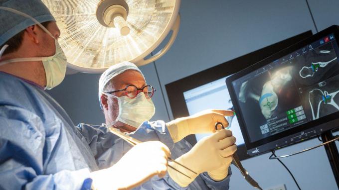 Tijdens de ingreep zelf genereert de computer de scan en kijkt de arts door een speciale VR-bril. Mini-zendertjes op de patiënt en op het operatiemateriaal communiceren met elkaar via een gps-systeem. Die directe koppeling bestond tot voor kort niet in de schouderchirurgie en maakt het systeem zo vernieuwend.