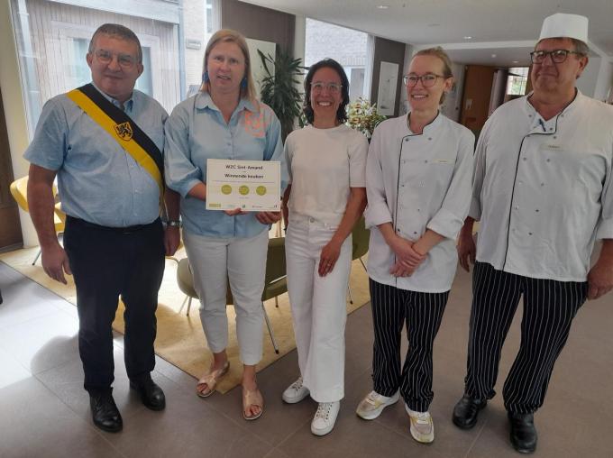 Medewerkers brachten toen voor het eerst de voedselverspilling in kaart: gemiddeld 455 gram per bewoner per dag. Daarop ondernam de keuken actie, met verfijnde portiegroottes en aangepast opschepmateriaal. Onlangs werd nog een meting uitgevoerd om de impact van de acties na te gaan. Een jaar later ligt de verspilling ruim 100 gram lager, een vermindering van 17 procent. Zo redt het wzc 6.700 kilogram eten. We zien schepen Dirk Desmet, directeur Isabel Vromant, Mélodie Arts (FoodWin), kok Lieven Van Hessche en diëtiste Justine Vanacker. (DV)