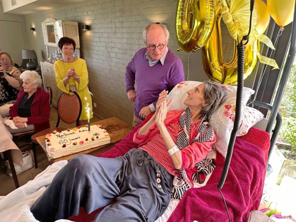 “Ze lag in kamer 307 op de afdeling Oncologie”, vertelt haar partner Rik Donze (67). “Ze vond dat de kamer wat meer kleur kon gebruiken. Het mocht groener en fleuriger, zoals bij ons thuis in Sint-Jan-ter-Biezen.” In dit landelijke dorpje bij Poperinge genoot Bet intens van haar omgeving. “Betje was een natuurmens en vertoefde graag in onze tuin en weides, tussen de bomen en de paarden. We waren altijd buiten. Vandaar het idee om een groot verjaardagsfeest te geven voor zeker honderd genodigden zodat het ziekenhuis met de opbrengst de wat kille kamer gezelliger kon inrichten voor lotgenoten die na haar komen. Betje heeft zelf nog enorm kunnen genieten van dat feest”, aldus Rik. “Verpleegsters brachten haar vrijwillig met een ambulance van het ziekenhuis in Ieper naar een restaurant in ons dorp.”