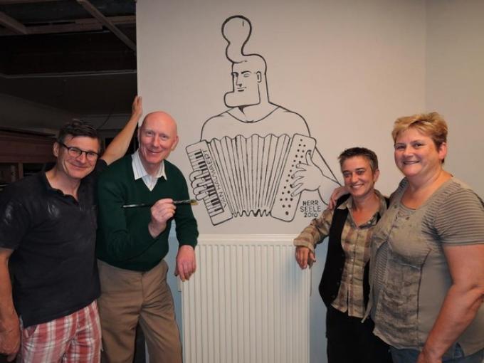 Toen Niels (24), die samen met Anton een deel van een tweeling uitmaakt ten huize Sap, aan Herr Seele voorstelde dat hij gerust zijn ding mocht doen op de oude muur, moest hij niet lang twijfelen. Hij haalde een penseel uit zijn met graffiti beklede bestelwagen en de zwarte verf werd even bij de buren geleend. In geen tijd schilderde hij een pop-art fresco van cowboy Henk op de muur met een ‘Van Hauwaert’-accordeon in de handen.