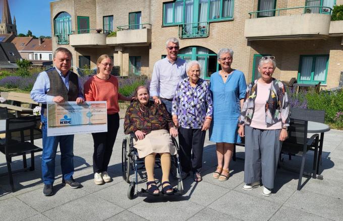 Op de foto herkennen we v.l.n.r. Piet Candeel, pastoraal medewerker Lieve Dierynck, bewoonster en gewezen vrijwilligster van de voedselbank in Poperinge Andrea Debleu (93), directeur Stefan Devlieger, bewoonster Agnes Depuydt (100) en dochter Marie-Josée en Katrien Durnez van vzw Op ’t Spoor.