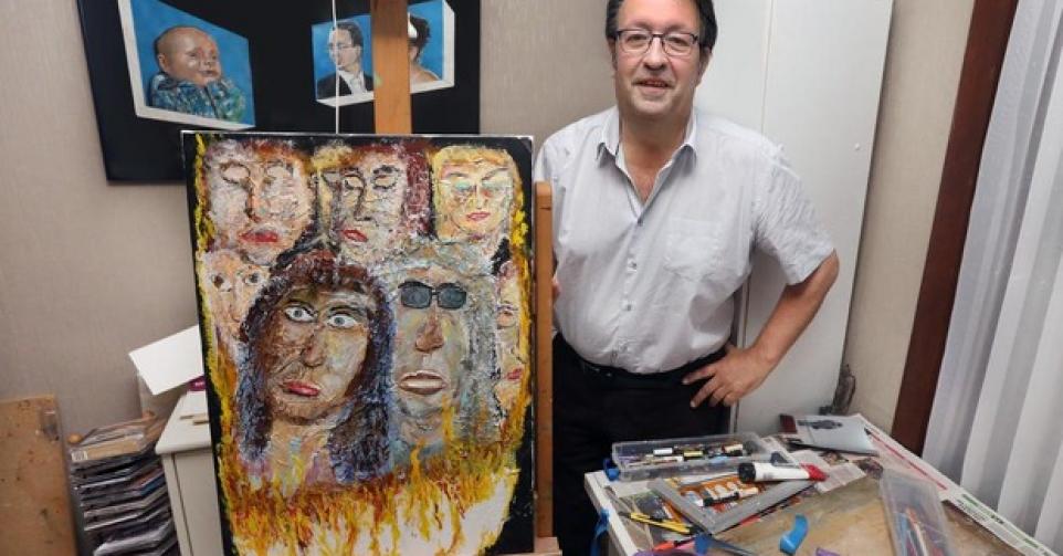 Hugo woont met zijn vrouw Rina Bullinck (69) in de Poperbosstraat. Ze hebben een zoon Ruben (35) en twee kleinkinderen: Julian (5) en Kato (2,5). “Van jongs af klopte mijn hart voor de kunstacademie, maar ik heb de opleiding architectenassistent gevolgd en ben begin jaren zeventig, na mijn legerdienst, als tekenaar gestart in een studiebureau in Brussel”, doet Hugo zijn verhaal. “Na een aantal jaar heb ik voor een totaal ander beroep gekozen en ben lid van de federale gerechtelijke politie geworden, specifiek bij de afdeling Zware Criminaliteit. Eerst in Brussel en Brugge en uiteindelijk vele jaren in Kortrijk. Ik was voor mijn werk dikwijls weg van huis en had nauwelijks tijd en ruimte om me toe te leggen op de kunst, een van mijn grote passies. Mijn hele leven heb ik graag getekend en geschilderd, maar als je na een loodzware dagtaak thuiskomt, heb je daar doorgaans geen zin meer in. Tot 2009. Toen vond ik het tijd om mijn artistieke goesting voeding te geven en ben ik in Torhout teken- en schilderlessen gaan volgen: van naaktmodel over stillevens en portretten tot acrylschilderen. Nu ben ik al een tijdje met die opleidingen gestopt en ga ik in mijn kleine thuisatelier mijn eigen weg. Sinds mijn pensioen in 2013 leg ik me volop op de kunst toe.”