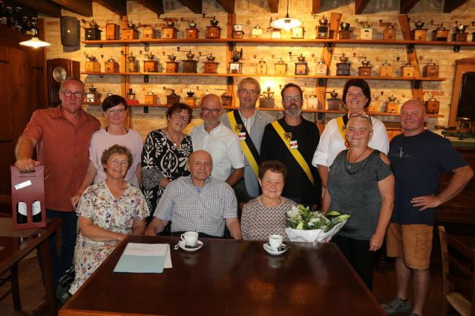 Vrijdag vierden Oscar Verhee (86) en Denise Decrock (81) in Wulvergem hun diamanten huwelijksverjaardag. Ze stapten op 21 augustus 1963 in het huwelijksbootje. Denise is afkomstig uit Wulvergem en na school gelopen te hebben in Wulvergem en Nieuwkerke, bleef ze thuis om mee te helpen op de boerderij van haar ouders. Oscar is afkomstig uit Nieuwkerke en na de jongensschool in Nieuwkerke ging hij nog twee jaar naar school in Ploegsteert om Frans te leren. Nadien bleef hij tot zijn negentiende thuis om mee te helpen op de boerderij en bij de buren. Na zijn legerdienst leerde Oscar Denise kennen in de Kosmos op de Rodeberg. Toen Oscar Denise vergezelde op weg naar huis, sprong de vonk over. Het huwelijksfeest vond plaats in Basseville in Wulvergem, waar nu ook hun diamanten feest doorging. Denise en Oscar boerden gedurende veertig jaar. Daarna verhuisden ze naar een nieuwbouwwoning. Het koppel kreeg vier kinderen: Benny, Veronique, Annick en Christof. Zij zorgden op hun beurt voor kleinkinderen en achterkleinkinderen. Nu genieten Oscar en Denise van hun huis en tuin. Op de foto zien we de jubilarissen met hun familie en een delegatie van het gemeentebestuur. (foto EF)