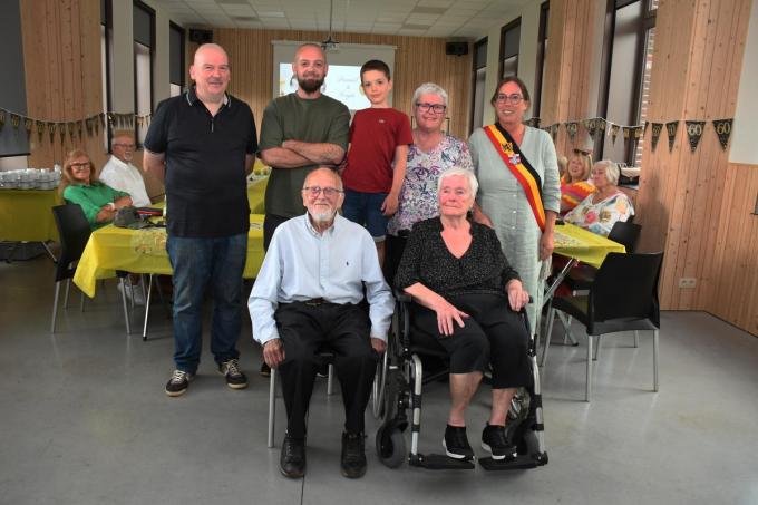 Daniël Six (81) en Sonja Salomez (78) vierden hun diamanten jubileum. Op 17 juli 1965 gaven ze elkaar het jawoord. Daniël woonde vroeger in Sint-Jan. Hij liep lagere school in Langemark en trok daarna naar het Ieperse VTI. Hij werkte bij BST in Ieper en daarna bij Philips in Roeselare. Sonja groeide op in Ieper. Ook zij werkte bij BST en het was daar dat ze Daniël leerde kennen. Nadien werkte Sonja ook nog bij Klippan. Na eerst in Ieper en daarna in Zonnebeke gewoond te hebben, vestigde het koppel zich in de Kerkstraat in Madonna. Op iedere motorcross kon men Daniël en Sonja terugvinden en een reisje versmaadden ze niet. Ze volgen hun dochter Nancy, die in de Ieperse gemeenteraad zetelt, op de voet. We zien de jubilarissen samen met schoonzoon Nico Landmeters, kleinzoon Gunther en achterkleinzoon Thor, dochter Nancy Six en burgemeester van Ieper Katrien Desomer. (foto EG)