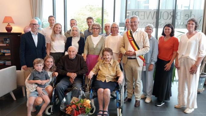 Agnes en Gaston huwden op 31 augustus 1955. Het koppel leerde elkaar kennen op het veevoederbedrijf van de ouders van Agnes in Vivenkapelle. Gaston zette het veevoederbedrijf verder en ging op zijn zestigste met pensioen. Agnes bleef thuis om voor de vier kinderen te zorgen. Het nageslacht bestaat verder nog uit vijf kleinkinderen en een achterkleinkind. Gaston gaat elke twee weken kaarten bij Okra in Vivenkapelle. Agnes voelt zich intussen goed thuis in De Stek waar ze regelmatig bezoek krijgt van Gaston en de kinderen. Een ruime delegatie van het stadsbestuur kwam de jubilarissen feliciteren. (PDV/foto PDV)