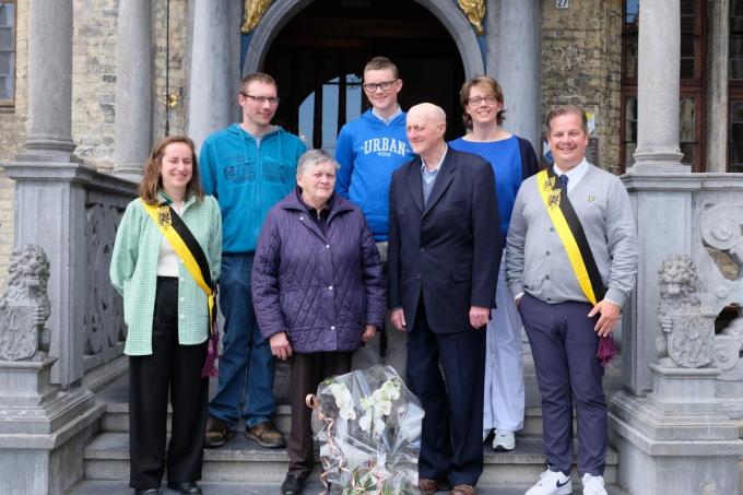Op de boerderij in Leisele waar Daniel zijn koeien verzorgde kwam Jeannine regelmatig langs om melk. Van het ene kwam het andere, en uiteindelijk volgde een huwelijk op 31 mei 1975 in Leisele. Samen waren ze helemaal klaar om aan een groot avontuur te beginnen; samen de boerderij runnen. Twintig jaar lang bleven ze op de boerderij in Leisele: Daniël tussen het vee en op het veld, en Jeannine combineerde het werk op de boerderij met een job in het ziekenhuis in Veurne, waar ze iedere werkdag de vroege shift deed. In 1990 viel het doek over de boerderij in Leisele en verhuisde het gezin naar een boerderij in Beauvoorde, waar Jeannine en Daniël tot vandaag genieten van de rust, de grote tuin en elkaar. Op de foto zien we het gouden paar met zoon Karel, kleinzoon Mateo en dochter Marlies. Schepenen Elise Sticker en Frederic Devos zetten het paar in de bloemen. (foto JTV)