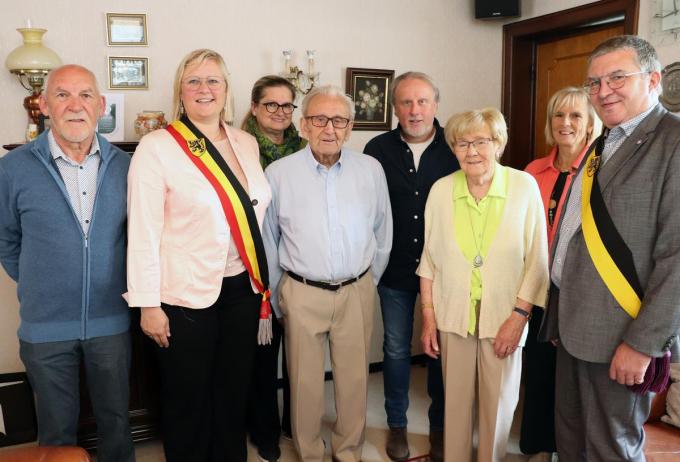 Burgemeester Degezelle en schepen Desmet trokken naar de jubilarissen om ze persoonlijk te feliciteren. Ze overhandigden de traditionele geschenken van de gemeente, maar hadden ook een gegraveerde schaal van de provincie West-Vlaanderen bij en een speciaal ingekaderde foto van het koningspaar. Raoul werd op 14 december 1932 in Kortrijk geboren en werkte bij de firma Bekaert. Beatrix werd op 9 november 1931 in Zwevegem geboren en was naaister. Nadine en Filip zijn hun twee kinderen en Dieter en Bjorn de twee kleinkinderen. Josse en Norah zijn de twee achterkleinkinderen. De jubilarissen wonen in de Rodenbachstraat in Zwevegem. (GJZ/foto GJZ)