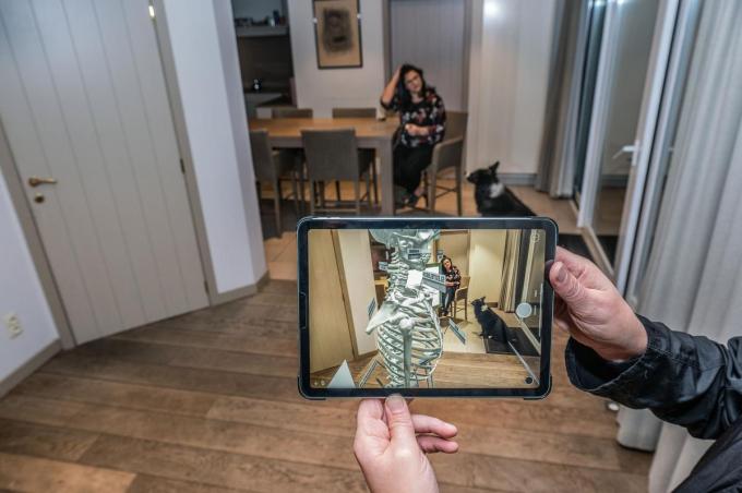 “Op die manier kan men het skelet overal neerzetten op voorwaarde dat men een smartphone heeft. Iedereen die de app heeft geïnstalleerd op zijn smartphone, kan het skelet bijvoorbeeld in de huiskamer, in de tuin of zelfs in het midden van de Ooststraat neerzetten en zijn anatomiecursus herhalen en inoefenen. En wanneer je het skelet hebt neergezet, kun je er rond wandelen of dichter kijken naar de beentjes in de handen of de voeten. Je kunt het skelet als het ware aanraken. Ik heb de app zaterdag getoond aan een vriend in het stadscentrum en toevallige passanten die op mijn tablet keken, zagen dus een skelet voor de boetiek staan waar wij stonden. Die mensen schrokken zich natuurlijk een hoedje.”